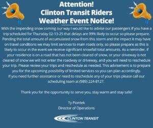 Attention Clinton Transit Riders – Weather Event Notice!